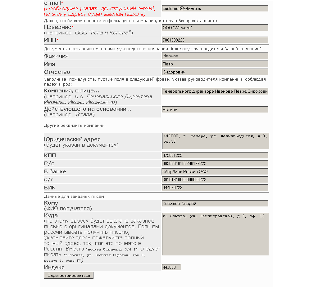 Автоматическая система оформления заказов на покупку программного обеспечения WTware позволит оперативно получать счета на оплату и готовить необходимые документы для бухгалтерии Вашей компании. Для работы с системой необходимо зарегистрироваться. К сожалению, бухгалтерия весьма дотошное занятие, поэтому необходимо указать так много данных. Настойчиво рекомендуем указывать все и правильно. Пример корректно заполненной формы можно посмотреть здесь. После нажатия кнопки "Зарегистрироваться" указанные Вами данные будут отправлены для контроля администрации WTware. В поле e-mail необходимо указать действующий адрес электронной почты, на котором нет системы защиты от спама. Очень желательно указывать именно тот адрес, с которого Вы вели и в дальнейшем будете вести переписку с службами поддержки пользователей WTware. Это значительно упростит нашу работу и позволит избежать ряда недоразумений. C вопросами по работе системы оформления заказов обращайтесь в службу лицензирования WTware. Внимание! Данная система предназначена только для оформления заказов юридических лиц на территории РФ для оплаты по безналичному расчету. Варианты оплаты для остальных случаев смотрите на сайте. |